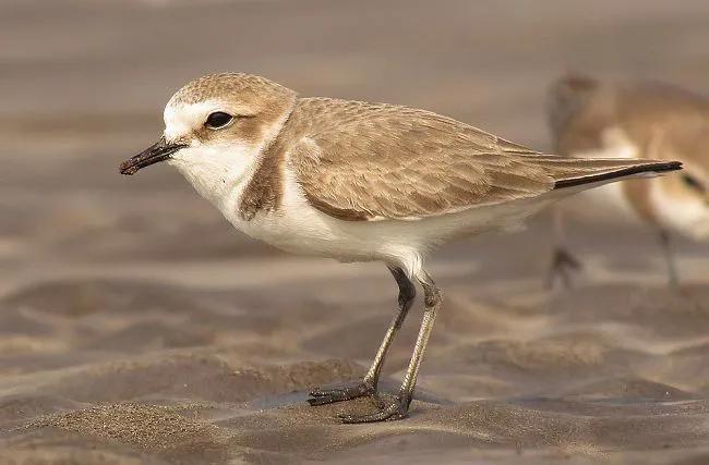 环颈鸻:鸻亚目.鸻科.鸻属鸟类。属中小型涉禽。体�-20厘米,体�-63克。嘴巴呈为黑色,脚为灰白色。额头.喉部.颈部.腹部为黑色,特别是喉颈部的白色羽毛,就像是带了条白色的围脖一样。